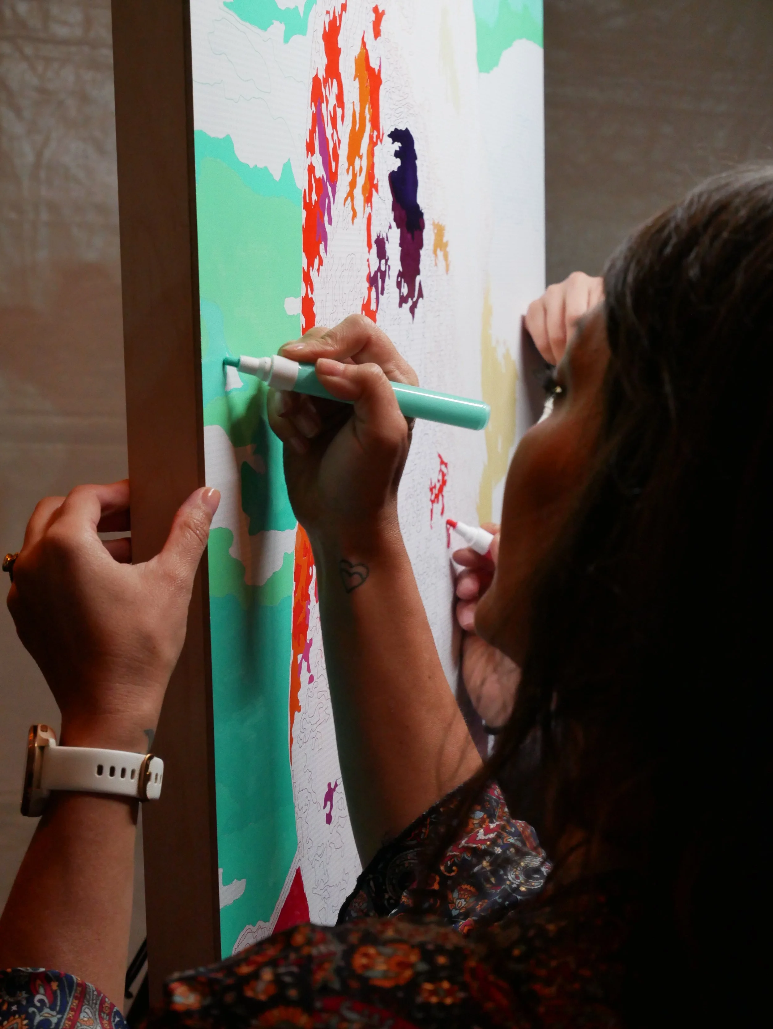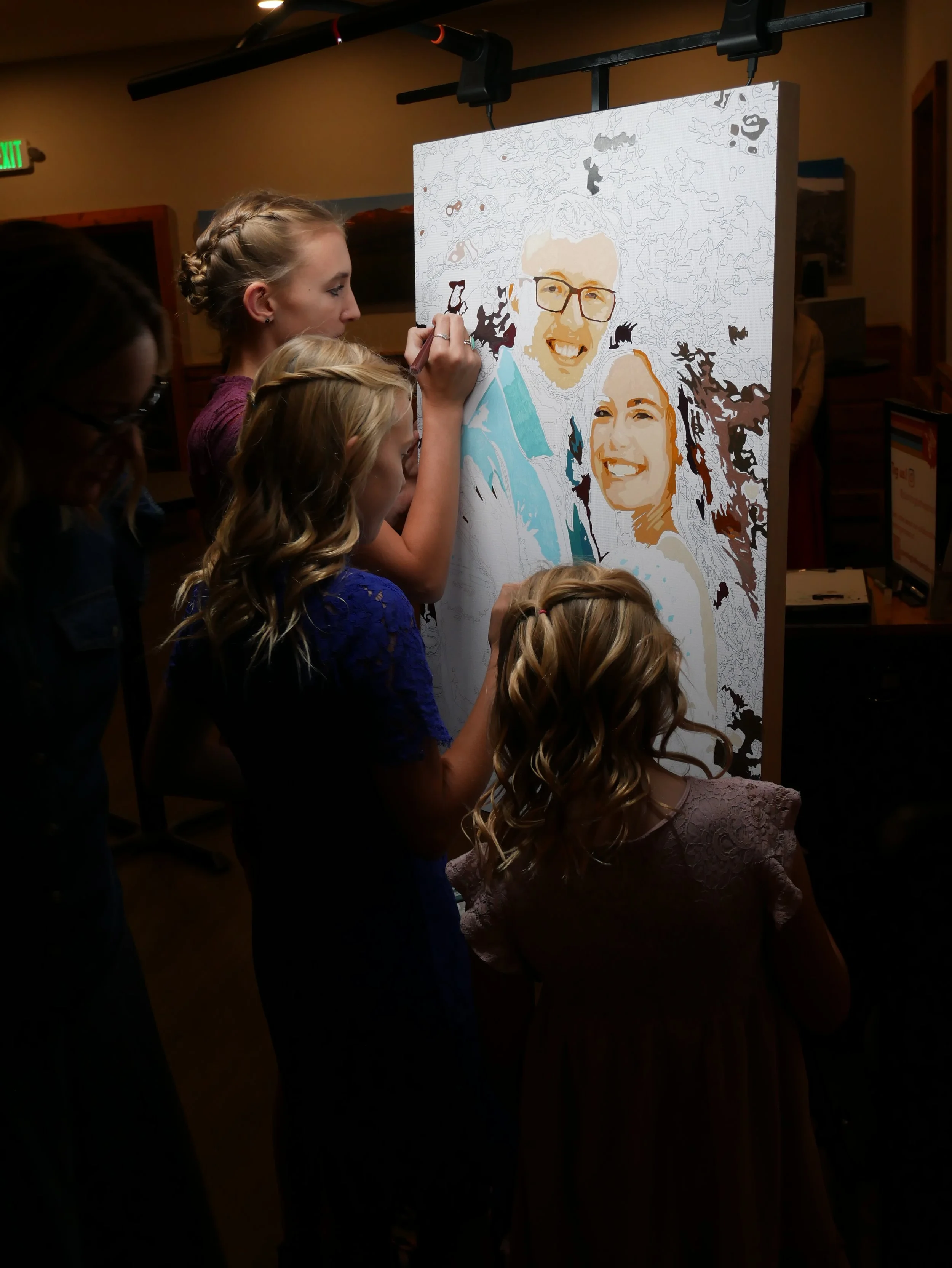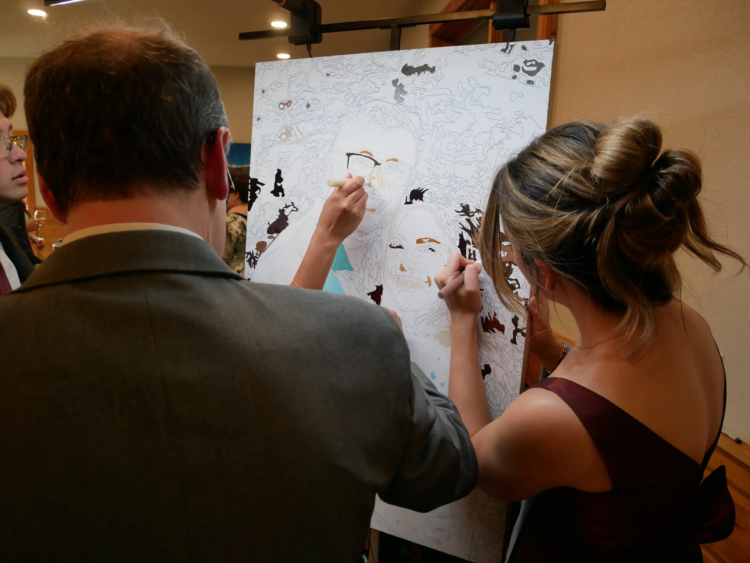 Each customized color palette is hand-mixed with high flow acrylic paint and loaded into German-engineered paint pens. If your guest can color—they can paint! And our team is onsite during the entire event to facilitate the creation of your heirloom work of art.